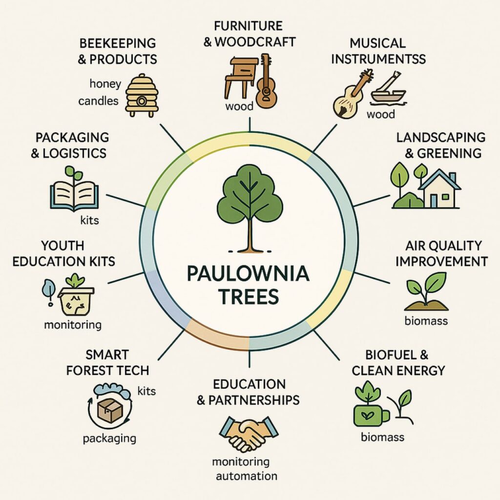• supplying Paulownia wood to workshops for violins, guitars, and ukuleles;